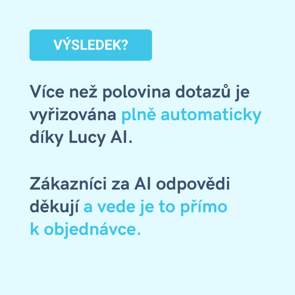 Více než polovina dotazů vyřídí automaticky Lucy AI. Zákazníci dostávají odpověď okamžitě a v mnoha případech je AI dovede k objednávce.