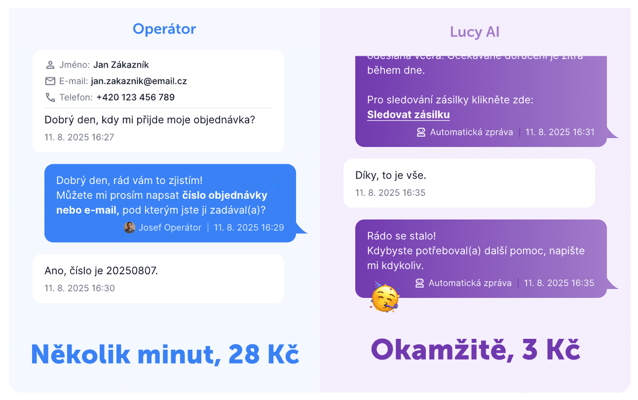 Na základě dlouhodobých interních dat jsme spočítali, že odpověď lidského agenta e-mailem stojí v průměru 28 Kč. Cena odpovědi AI agenta je mnohem nižší. Například u Lucy AI jsou to 3 Kč za odpověď e-mailu a 1 Kč za odpověď na live chatu.