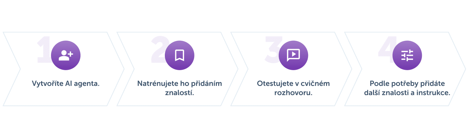 vládnete to do 5 minut. Nejprve vytvoříte AI agenta a natrénujete ho přidáním znalostí. Následně ho otestujete v cvičném rozhovoru a podle potřeby přidáte další znalosti a instrukce. To je vše.