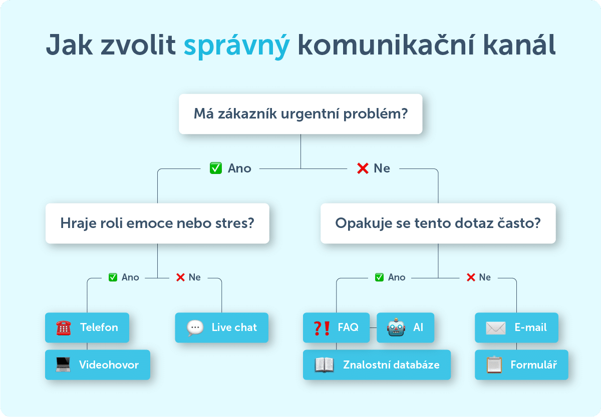 Tento jednoduchý strom vám pomůže rychle rozhodnout, jaký komunikační kanál zvolit podle naléhavosti dotazu a emocí zákazníka.